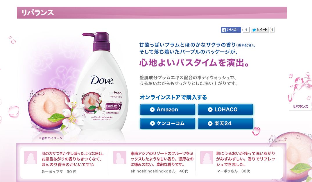面白いなと思ったのが、「オンラインストアで購入する」というリンクがついていること。飛び先は「Amazon」「ケンコーコム」「LOHACO」「楽天24」です。消費財では、デジタルでキャンペーンをしても購入は近所のドラッグストアということが多いと思うのですが、デジタルで完結する手段も入れているのが新しいな、と思いました。日用品なので、ダイレクトでECをおこなっていないので、ECサイトが選択されたのだと思うのですが、なぜこの4つになったのか、選択理由を知りたいです~。