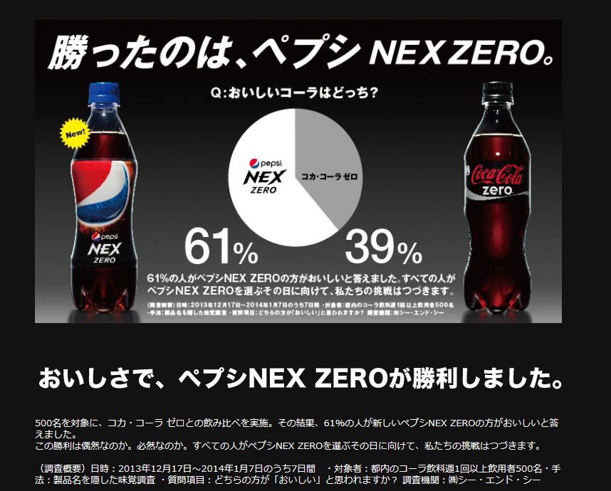 ペプシネックスがコカコーラzeroを対象とした比較広告を実施中です。