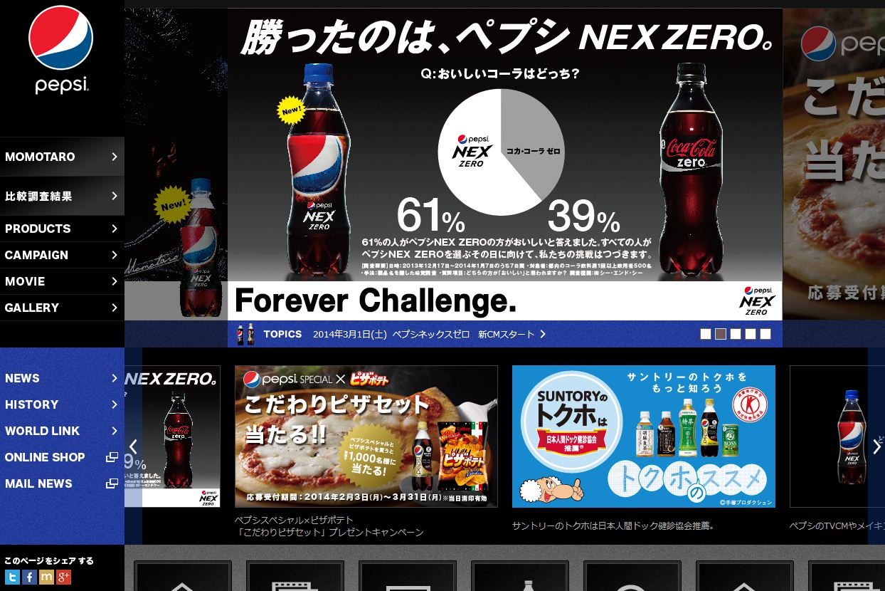 ペプシネックスゼロの比較広告、おもしろいのが、堂々とコカコーラゼロの画像を使っているところ。YahooのTOPジャックの背景でも、右側はコカコーラゼロ、左側はペプシネックスゼロの画像をどーんと配置してプロダクトプレースメントを実施してます。ある意味コカコーラゼロのビジビリティもあげているわけで。